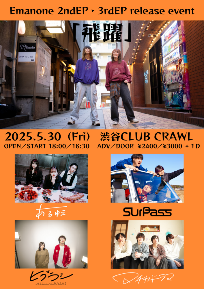 5月30日(金) SCHEDULE 2025/05/30(金) 渋谷CRAWL 地図を表示 OPEN18:00/START18:30 Emanone 2ndEP・3rdEP release event 取り置きフォーム URLをコピーする 報告する