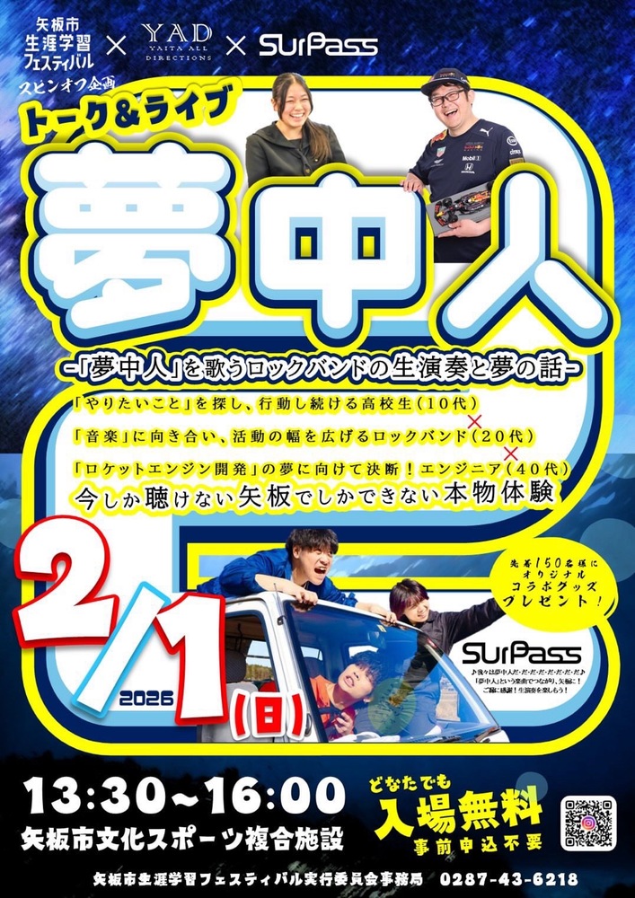 トーク&ライブ『夢中人』 〜「夢中人」を歌うロックバンドの生演奏と夢の話〜 SCHEDULE 2026/02/01(日) 栃木県 矢板市文化スポーツ複合施設 地図を表示 🕰️ OPEN 12:30 / START 13:30 / 終了予定 16:30 🎫 FREE (申し込み不要) なんと❗️ワンマンライブです‼️ 入場無料ですのでどなたでもお気軽にお越しください! URLをコピーする 報告する